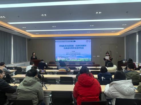 沙珍霞教授首先以“养殖鱼类抗病策略:抗病机制解析、抗病遗传育种及营养免疫”为题,详细介绍了半滑舌鳎抗病免疫和调控机制、抗内脏结节病基因组选择育种以及免疫增强剂对鱼类抗菌感染评价的研究内容。之后,又以“健康密码-科学饮食”为题进行了一场生动有趣的科普讲座,围绕大家关心的健康饮食问题,提出了健康食品选择、平衡膳食搭配以及科学饮食制作等方面的建议。
