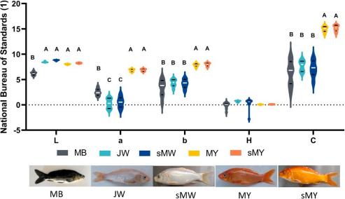 水产所朱华研究员团队首次基于靶向代谢组学技术构建并优化了锦鲤类胡萝卜素类相关代谢物的高通量定量检测技术流程。利用靶向代谢组学检测技术,团队率先开展了不同品系锦鲤在不同养殖温度和季节环境中的类胡萝卜色素及相关代谢物血清水平追踪。此外,基于CIELab颜色空间理论,开展了锦鲤体色的无损、连续、量化评价,通过对锦鲤不同颜色花纹进行亮度、黄度、红度、色调和色饱和度等多维度比较,实现了锦鲤体色的数据化管理,突破了肉眼评判的主观局限性。研究发现急性温度波动(25±5oC)可能通过肾上腺素-鸟嘌呤途径改变锦鲤皮肤亮度,研究结果为锦鲤体色改良和定向育种提供了理论基础。