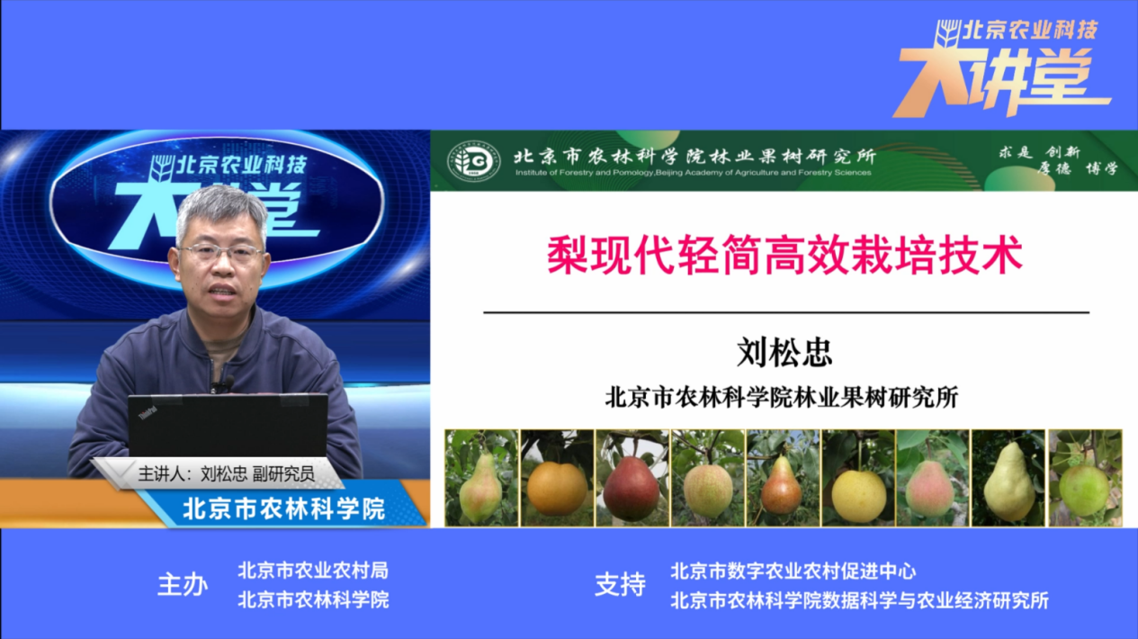随着我国适龄劳动人口减少、生产资料价格提升,果园雇工价格逐年提高,梨果生产成本随之攀升。梨轻简栽培技术适合果园机械化操作、标准化生产,可以有效节省劳动力成本。2025年10月23日下午,皇家娱乐城 北京农业科技大讲堂邀请院林业果树研究所刘松忠副研究员为大家讲解“梨现代轻简高效栽培技术”,帮助果农实现梨轻简、省力、高效栽培,助推梨生产管护节本、增产、增效。