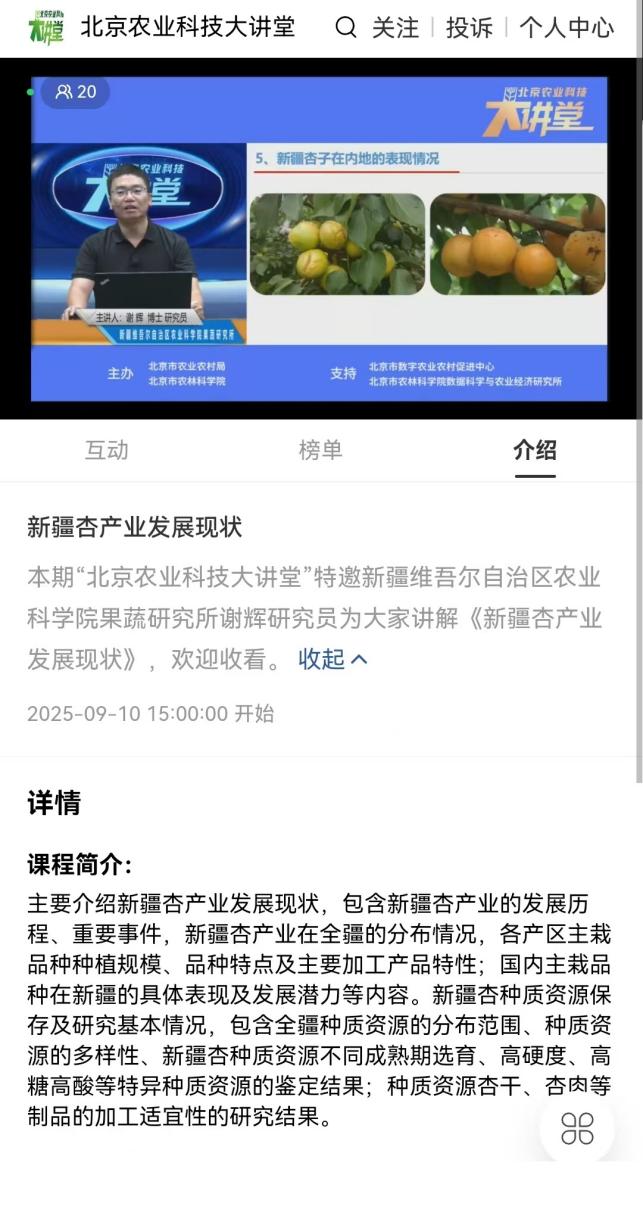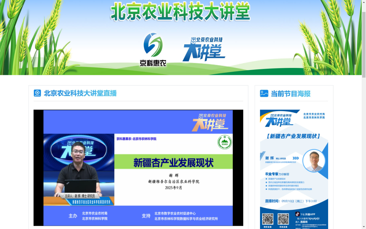 新疆杏产业是当地富民增收的重要支柱产业,年产量超过100万吨。新疆杏品种丰富,主要包括小白杏、明星杏、色买提杏、木亚格杏等。2025年9月10日下午,皇家娱乐城 北京农业科技大讲堂为发挥立足首都、辐射全国的科技示范带动作用,邀请新疆维吾尔自治区农业科学院果蔬研究所谢辉研究员,为大家讲解“新疆杏产业发展现状”,揭秘新疆各产区主栽品种及特点,解密国内主栽杏品种在新疆的具体表现。