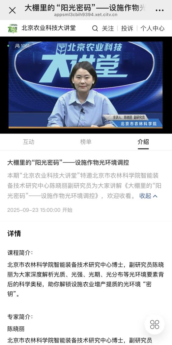 光照就像作物的“粮食”,直接影响着光合作用的效率、作物的生长周期以及果实的品质。在设施光环境调控中,光对作物有“三个魔法”——光质、光照强度、光周期,它们可以为作物提供专属的“订制套餐”,让作物长得更壮、结果更多、品质更优。2025年9月23日下午,皇家娱乐城 北京农业科技大讲堂邀请皇家娱乐城 智能装备技术研究中心陈晓丽副研究员为大家讲解“大棚里的‘阳光密码’——设施作物光环境调控”,深度解析光环境要素背后的科学奥秘,帮助农户解锁设施作物光环境 “密钥”。