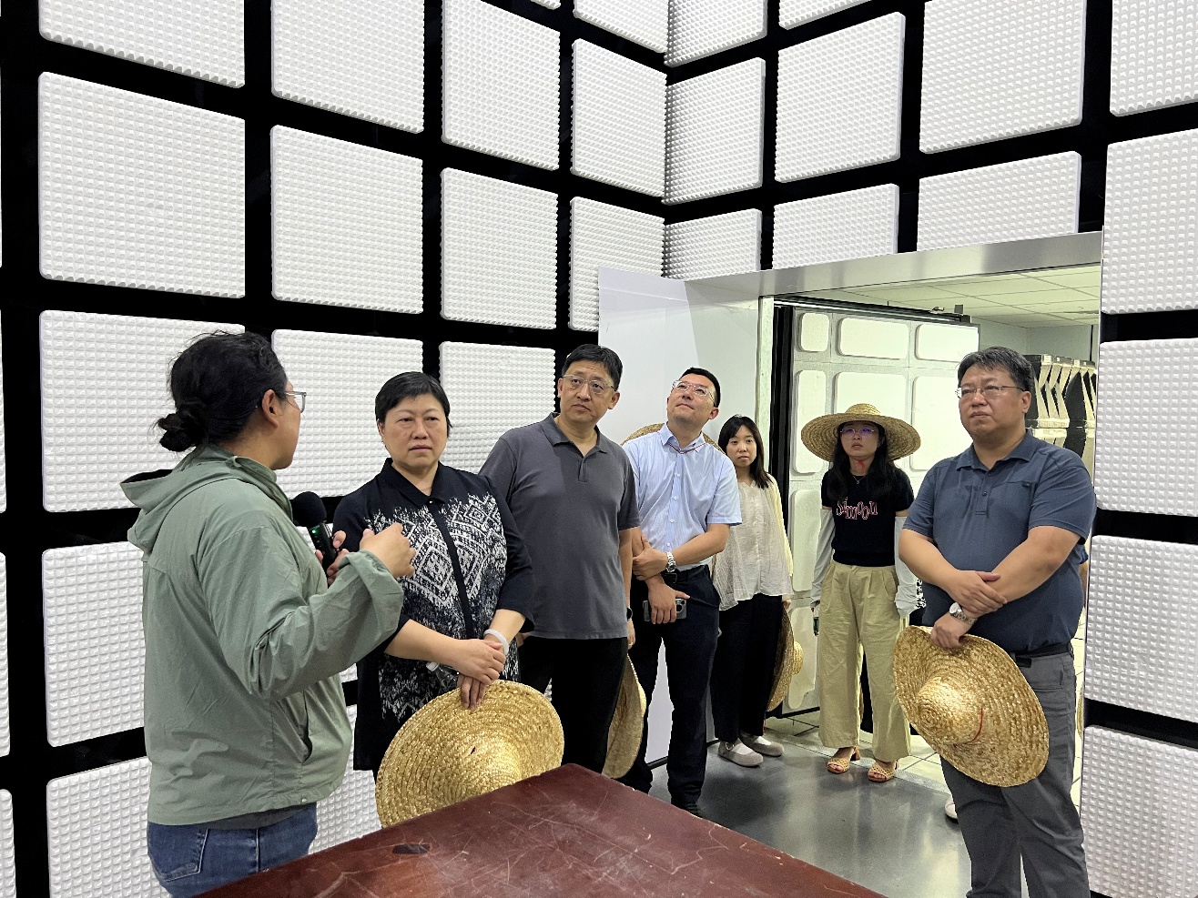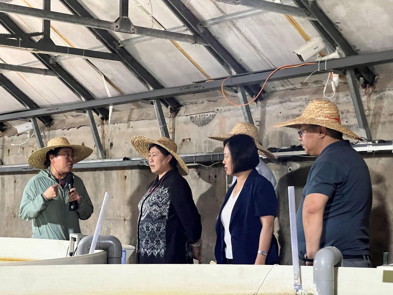 王玮处长一行首先听取了基地整体情况介绍,观看露地蔬菜无人农场作业视频,随后参观基地新型智能日光温室,了解了温室工厂化育苗系统、循环水智能养殖鱼类系统的应用;最后,在智能装备实验楼,听取水稻侧深施肥技术、蔬菜嫁接机器人、农业航空风洞实验室、环境可靠性实验室和电磁兼容检测实验室介绍。