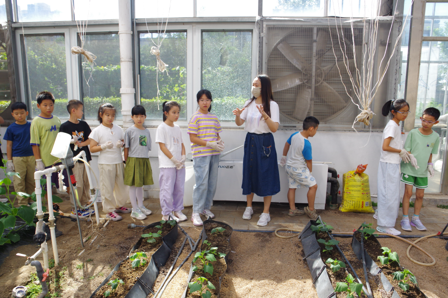 第二场“走进试验田”移至成果展示温室。项目主持人、数科所曹承忠副研究员带队,营资所徐子莹老师沿途讲解无土栽培、基质栽培、鱼菜共生等试验和技术,孩子们边听边记录,不时提问,都市里的孩子们第一次近距离接触到了农业种植,并被深深吸引。