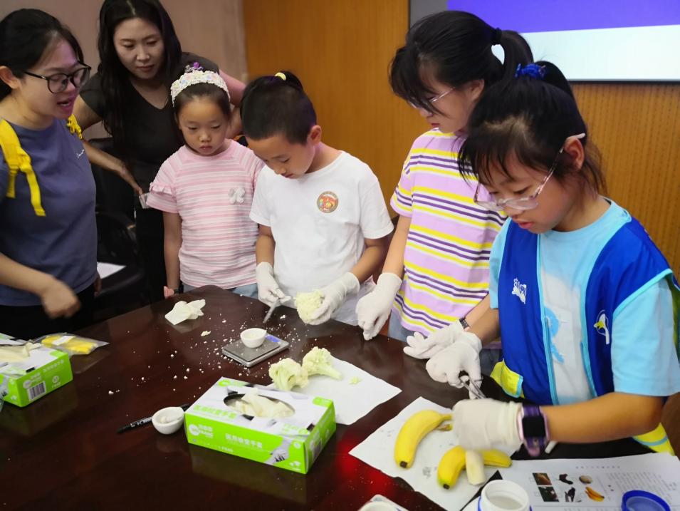 体验营由“走进实验室”、“走进试验田”和“我来学种植”三场活动组成,各具特色。首场“走进实验室”由生物所郑登俞老师主持。郑老师用10分钟图解DNA奥秘,随后将同学每4人一组,亲手实践提炼香蕉和花菜的DNA过程。经过研磨、过滤、酒精沉淀,不到20分钟,同学们就成功提取出了白色絮状DNA,大家惊呼“原来基因看得见!”