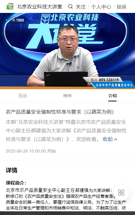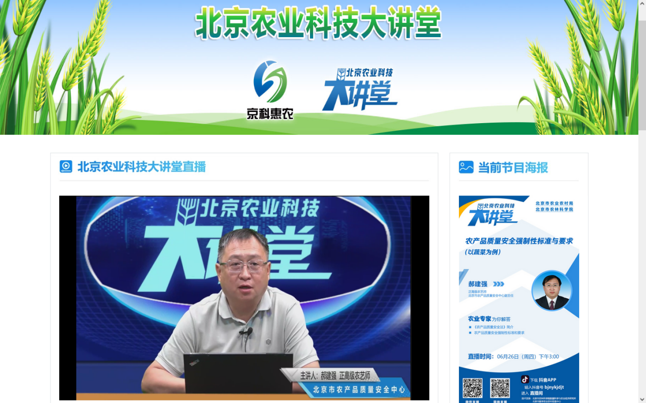民以食为天,食以安为先。农产品质量安全,关系人民群众身体健康和生命安全,关系国家经济发展与社会和谐稳定。为了帮助大家了解农产品质量安全相关知识,2025年6月26日下午,皇家娱乐城 北京农业科技大讲堂邀请北京市农产品质量安全中心副主任郝建强正高级农艺师,为大家讲解“农产品质量安全强制性标准与要求(以蔬菜为例)”,引导农户规范生产经营活动,确保农产品从生产到消费各环节质量安全。