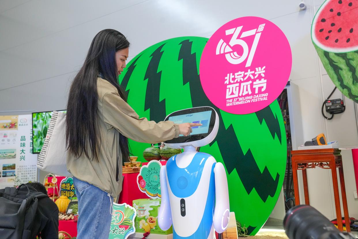 在大兴农产品展区内,大兴西瓜、樱桃等本地优质农产品悉数登场,现场人潮涌动,热闹非凡。与传统展品相映成趣的是一抹科技蓝——智能服务机器人“农科小智”以其灵动的语音交互、智慧的内容推送和充满未来感的造型成为展区的“科技明星”。它不仅承担起农产品信息讲解和智能导览等多项展示任务,还实时推送西瓜节活动安排与农业科技知识,实现了从静态展示到动态服务的转变,极大提升了展区的智能化水平与观众的沉浸式体验感,生动展现了数字技术赋能农业的无限可能。