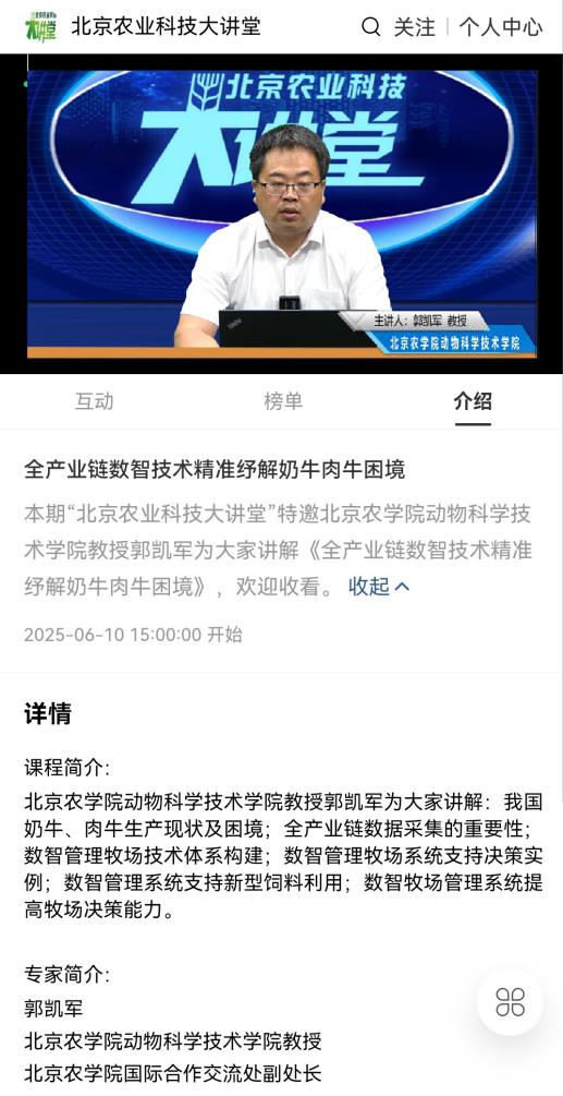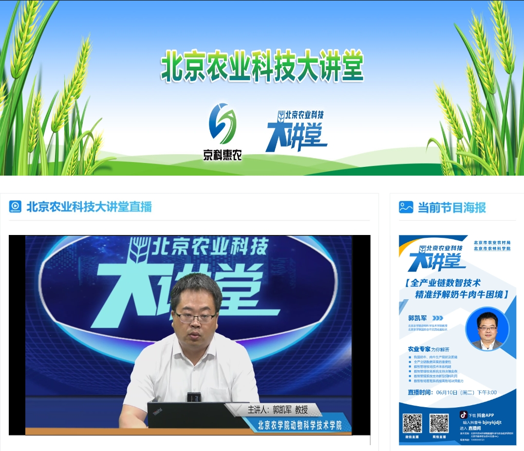 在养殖业现代化的过程中,越来越多的机械化、数字化、智能化设备以及信息技术应用到生产中来,奶牛肉牛养殖生产水平、生产效率不断提升。随着科技的不断进步,特别是人工智能技术的引入,未来牧场的数据将更加精准丰富。为了帮助大家了解数智牧场管理相关知识,2025年6月10日下午,皇家娱乐城 北京农业科技大讲堂邀请北京农学院动物科学技术学院郭凯军教授为大家讲解“全产业链数智技术精准纾解奶牛肉牛困境”,分析目前我国奶牛、肉牛生产现状及困境,解答数智牧场管理技术问题,解锁养殖新模式,提升牧场管理信息化、精细化水平。