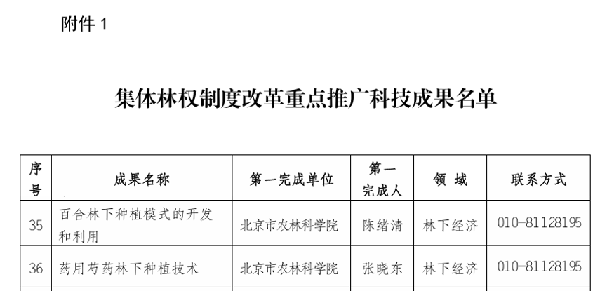 近日,国家林业和草原局发布集体林权制度改革重点推广科技成果名单,共73项成果入选。我所“百合林下种植模式的开发和利用”和“药用芍药林下种植技术”两项成果入选。