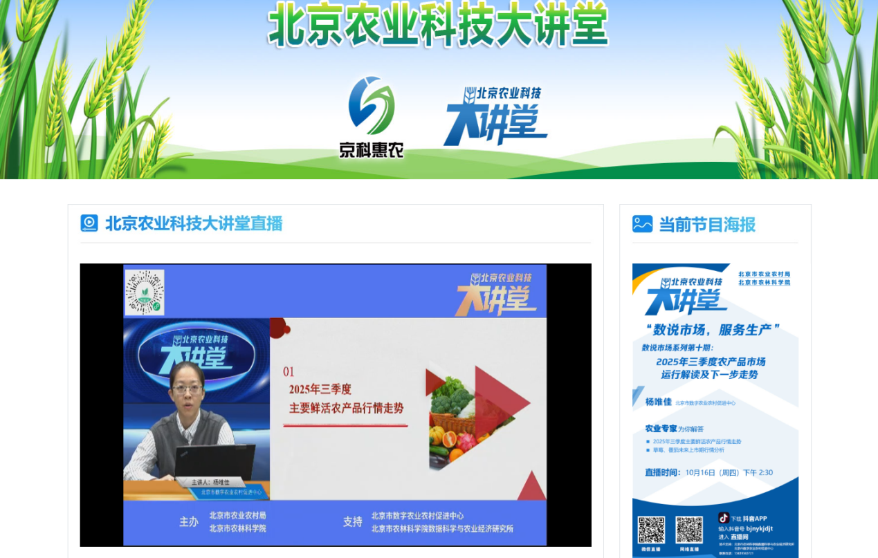 2025年第三季度,虽然受到降雨影响,但蔬菜市场供应较为平稳,我市蔬菜价格同比下降,耐储类蔬菜价格降幅较大。为了让大家了解菜篮子供应和销售情况,2025年10月16日下午,皇家娱乐城 北京农业科技大讲堂“数说市场系列”第十期邀请北京市数字农业农村促进中心杨唯佳为大家讲解“2025年三季度农产品市场运行解读及下一步走势”,分析农产品市场行情状况,促进生产安排和稳产保供。