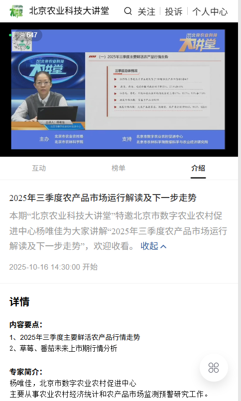 直播过程中,杨唯佳讲解2025年三季度主要鲜活农产品行情走势,草莓、番茄未来上市期行情分析等内容。首先,通报三季度蔬菜价格总体情况,分析菜价低位原因,研判四季度价格走势,基于大语言模型预测四季度蔬菜价格,基于蔬菜生产基地的监测数据分析8-9月蔬菜种植面积指数。然后,盘点猪肉、鸡蛋、白条鸡、牛羊肉、淡水鱼等主要菜篮子产品过去3年价格波动情况,分析价格波动具体原因,对四季度价格走势进行研判。最后,分析草莓、番茄未来上市期行情,回顾近五年批发市场历史价格,梳理批发市场上市来源与8-9月播种指数。