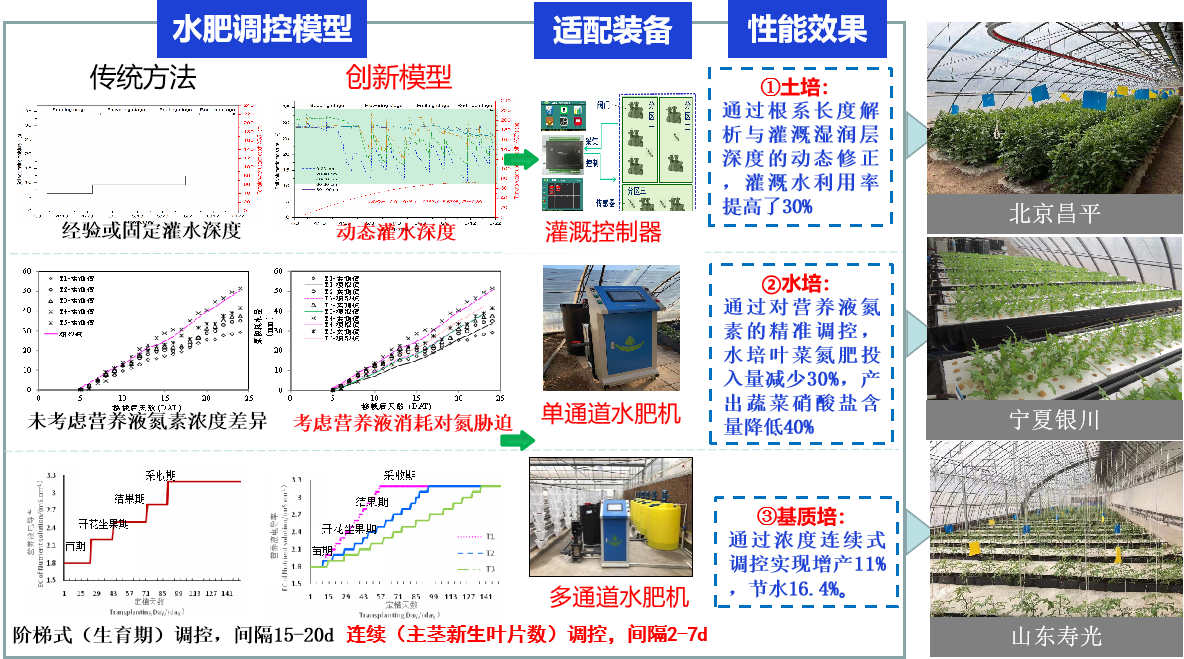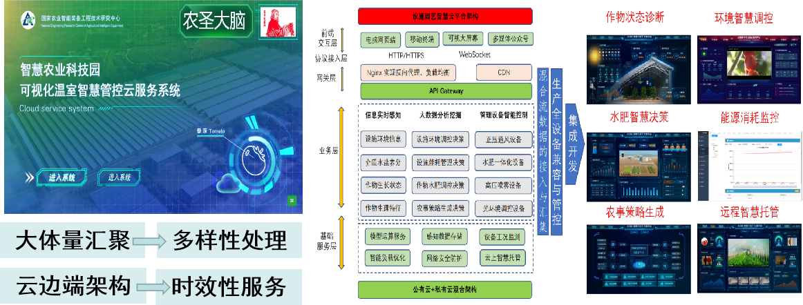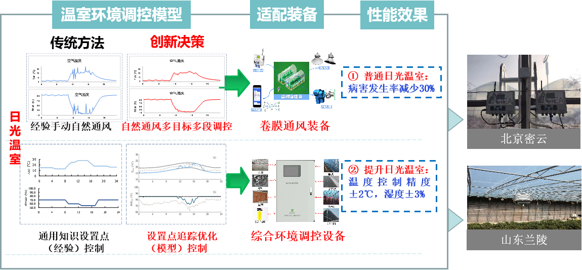 日光温室生产数字化管控技术,针对现有大部分日光温室环境调控能力较差、管理方式较为粗放、配套装备服务缺失、产能未完全开发、人工投入成本占比高等问题,利用物联网、人工智能、大数据、云计算等新一代信息技术赋能,从“智能感知—综合管控—服务平台”三个方面驱动创新与集成应用,形成了技术创新型、平台服务型和场景应用型的日光温室生产数字化技术集成与多场景应用体系。
