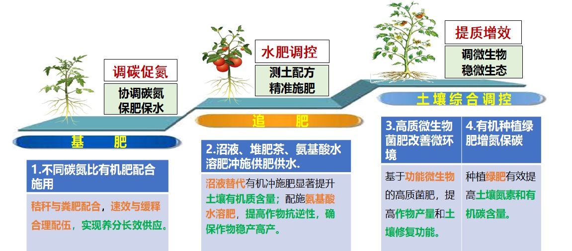 该技术中基肥利用不同碳氮比有机肥配合施用,实现速效与缓释肥效的合理配比,实现养分全生育期长效供应。追肥利用特有的废弃物处理技术包括但不限于沼液、堆肥茶、氨基酸水溶肥等液体肥,基于作物生育期需肥特性及土壤养分精准化随水冲施,其中低、中量沼液替代有机冲施肥作物产量提升10%-20%,且显著提升土壤有机质含量;施用氨基酸水溶肥可以减少肥料投入量10%左右,且确保作物稳产同时显著提高了品质。绿肥利用有机农业种植空闲期种植绿肥并粉碎还田可以有效提高土壤氮素和有机质含量。微生物菌肥利用其微生物解磷、解钾、固氮、防病等功能,确保有机肥中养分得到充分释放与利用,并改善土壤微生态环境,增强土壤生物修复功能。