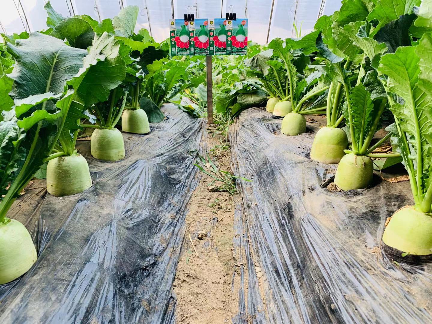 翠丹翠丹:叶片近板叶,叶色深绿,株型半直立。肉质根近圆形,根皮出土绿色,入土白色,表皮光滑,商品性...