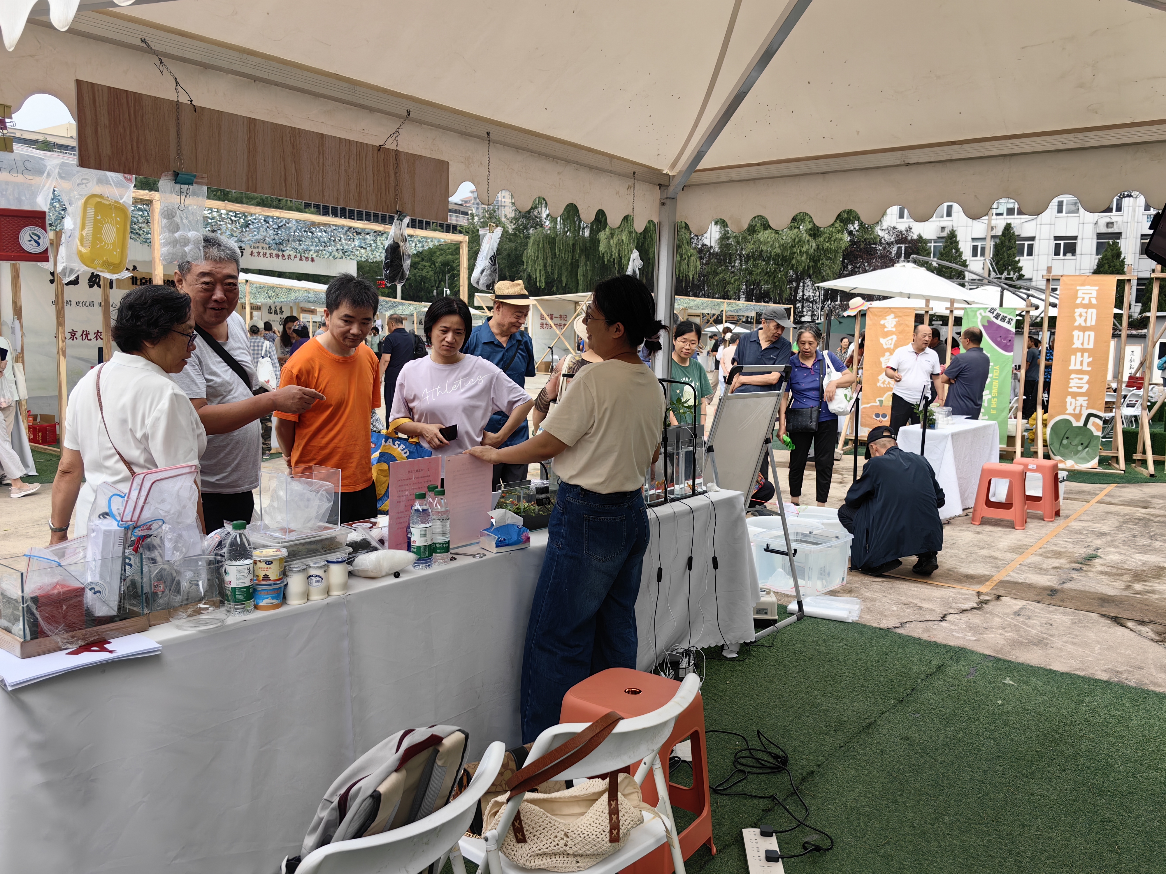2025年8月30日,在北京市农业农村局“北苑路88号”北京优农特色农产品市集上,水产所集中展示了萌宠鱼菜共生家庭生态系列产品。该系列产品是水产所结合水产“进家庭、进庭院”的新发展思路,自主创新集成开发的系列科研成果,涵盖了萌宠鱼菜共生家庭多功能生态缸、“鱼-菜-草”萌宠生态缸、硝氧魔方系列滤材、微生源水质调节胶囊,以及萌宠鱼盒、DIY盒、专用照灯、水族过滤器、造景材料等26项自主创新集成成果,首次亮相便受到了广大市民的高度关注与喜爱,现场先后共有1000余人驻足参观咨询。