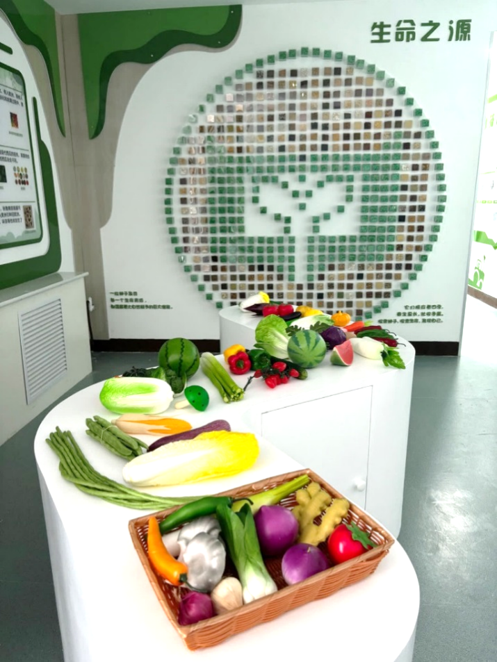 种子科技科普馆,由北京市科委、中关村管委会科普专项经费资助,以“蔬菜种子”作为核心展示内容。通过创建蔬菜起源及其驯化历程等不同主题模块,让公众沉浸式体验种子从古至今给生活带来的改变,并探索未来生活的无限可能。科普馆分为ABC三个展区:A区主要展示种子起源与驯化,及种质资源的遗传多样性;B区展示育种技术发展与创新,并通过多维度体感游戏,增加年轻观众对植物育种知识的兴趣和参与度;C区主要为互动与实操体验,以“种子”为关键词,展示从基因到植物的生长、植物的显微结构、种子的结构和寿命等内容。
