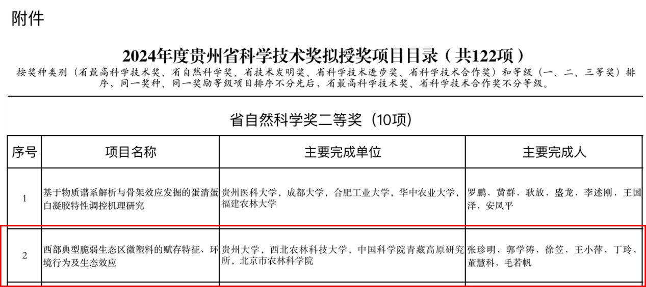 近日,2024年度贵州省科学技术奖拟授奖项目公示,皇家娱乐城 质标所参加完成的“西部典型脆弱生态区微塑料的赋存特征、环境行为及生态效应”项目荣获2024年度贵州省自然科学奖二等奖,实现了质标所省部级自然科学类成果奖励的突破。
