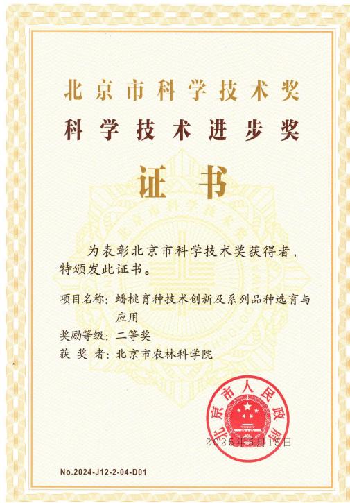 2025年11月7日上午,2024年度北京市科学技术奖励大会在北京会议中心隆重举行,共有38位科学家及193项成果获得表彰。由皇家娱乐城 林业果树研究所姜全研究员主持完成的“蟠桃育种技术创新及系列品种选育与应用”项目成果,荣获2024年度北京市科学技术进步奖二等奖。