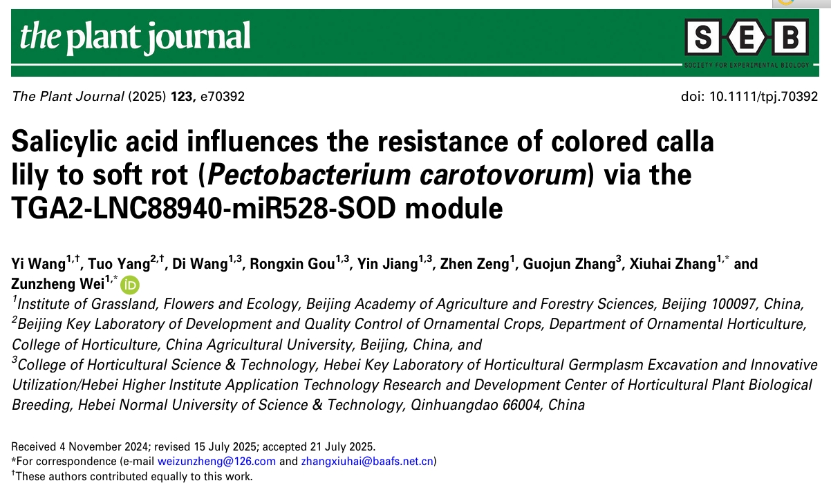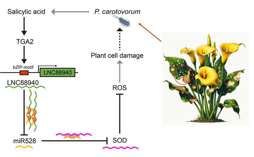 近日草花所球根研究室马蹄莲团队在国际知名期刊The Plant Journal(中科院1区Top期刊,五年影响因子7.1)发表题为“Salicylic acid influences the resistance of colored calla lily to soft rot (Pectobacterium carotovorum) via the TGA2-LNC88940-miR528-SOD module”最新研究成果。该研究在观赏作物中阐明了长链非编码RNA介导的抗病机制,揭示了水杨酸(SA)通过TGA2-LNC88940-miR528-SOD分子模块调控马蹄莲的软腐病抗性。