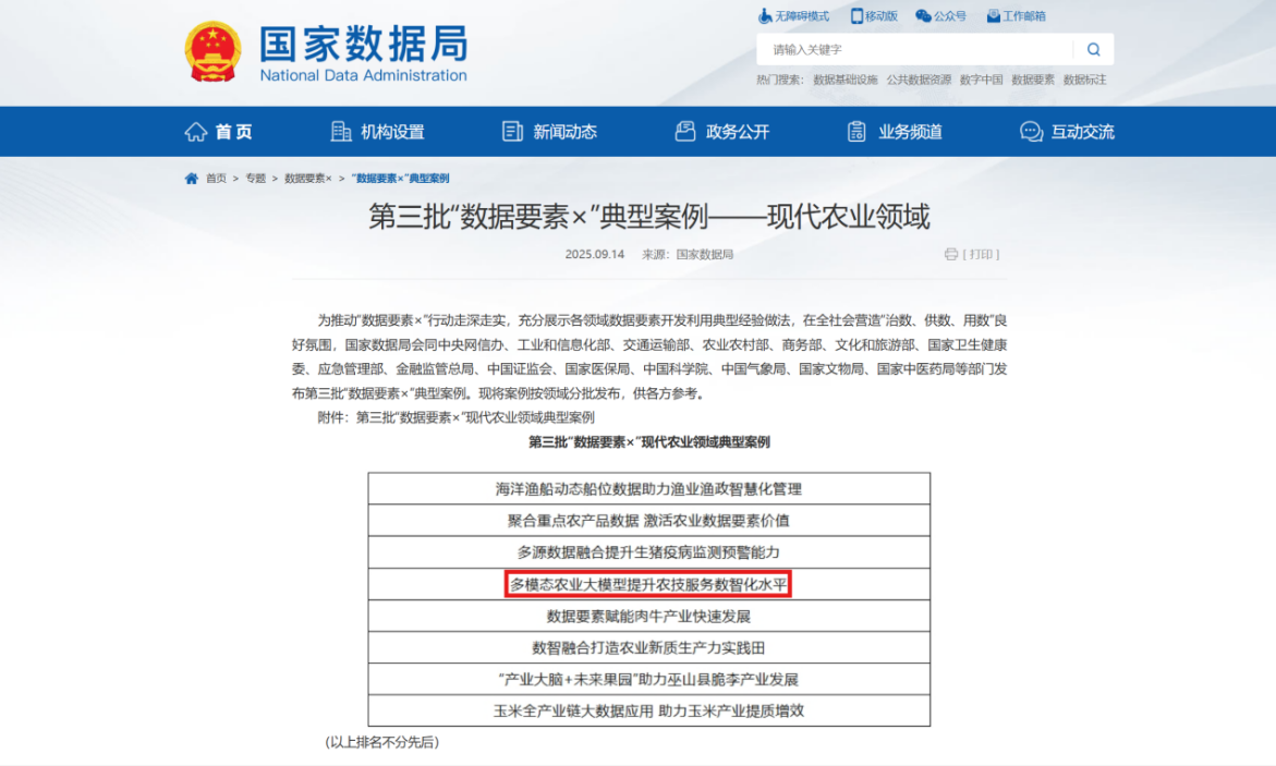 2025年9月14日,国家数据局公布了第三批“数据要素×”现代农业领域典型案例,皇家娱乐城 数据科学与农业经济研究所基于“农科小智”大模型申报的成果“多模态农业大模型提升农技服务数智化水平”成为入选的全国八个典型案例之一。