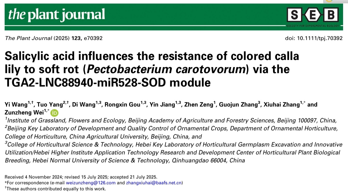 草花所马蹄莲团队The Plant Journal发文揭示水杨酸介导的软腐病抗性分子调控模块/ 08-05 -