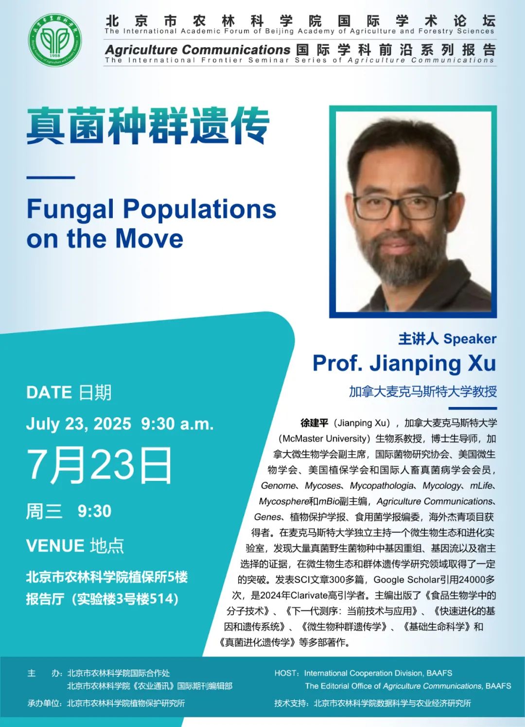 活动将于7月23日(周三)上午09:30,在皇家娱乐城 植保所5楼报告厅举办,届时将邀请到加拿大麦克马斯特大学(McMaster University)生物系教授、加拿大微生物学会副主席徐建平进行“Fungal Populations on the Move”(真菌种群遗传)的学术报告和交流。