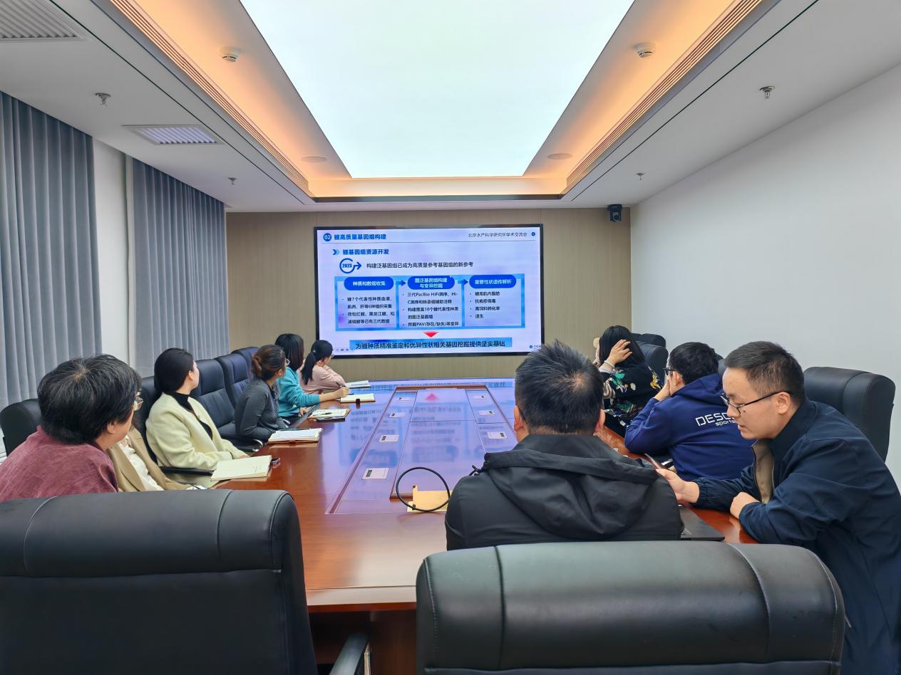 会上,徐庆磊副研究员首先生动阐述中国鲤鱼的古典文化内涵,明确鲤鱼作为我国重要经济鱼类的产业价值。接着围绕 “鲤高质量基因组构建”“鲤异源四倍体起源与基因组不对称进化”“鲤种质评价与性状遗传解析”“水产分子育种研究现状” 及 “未来展望” 五大方向展开精彩汇报。他指出泛基因组为鲤种质精准鉴定、优异性状相关基因挖掘奠定了坚实基础,强调未来生物育种属于智慧育种时代。在交流环节中,参会人员围绕泛基因组育种技术要点、种质资源高效利用等核心问题进行讨论,现场学术氛围浓厚。