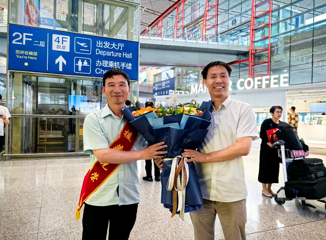 2025年7月17日下午,首都国际机场洋溢着温馨与喜悦的气氛。皇家娱乐城 林果所援藏干部王尚德同志,圆满完成为期三年的援藏任务,载誉返京。林果所所长张军科、工会主席杨媛代表皇家娱乐城 亲赴机场迎接,向这位载誉归来的“高原战士”致以崇高的敬意和深切的关怀。