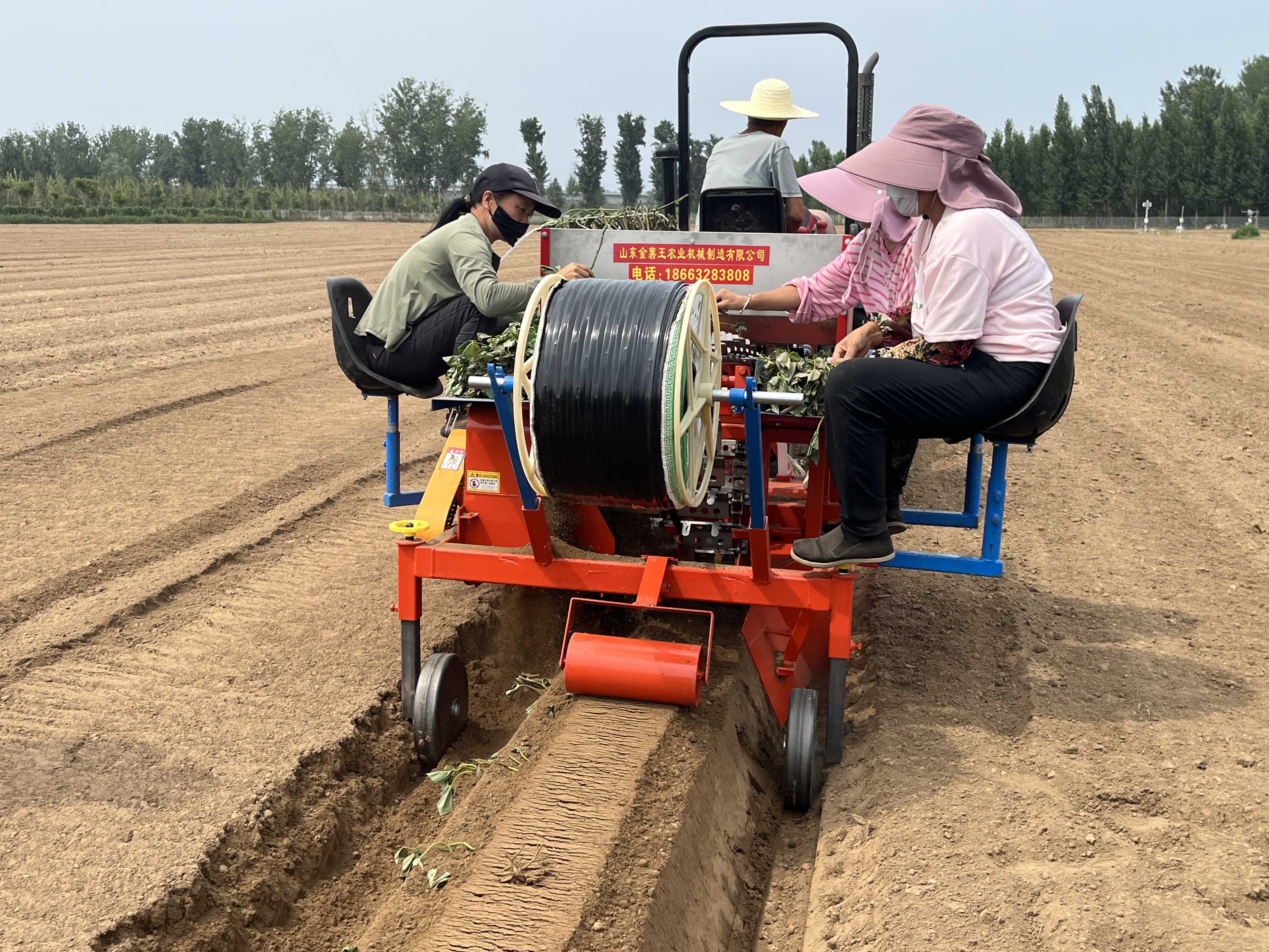 甘薯移栽机田间试验示范是本次现场会的一大亮点。烈日下,连接在拖拉机后方的甘薯移栽机,在行驶中将原本平整的土地起出一行高36厘米、宽42厘米的田垄,3名农场的工人坐在移栽机上有条不紊地将薯苗摆在传送装置上,薯苗被精准、快速送入田垄。