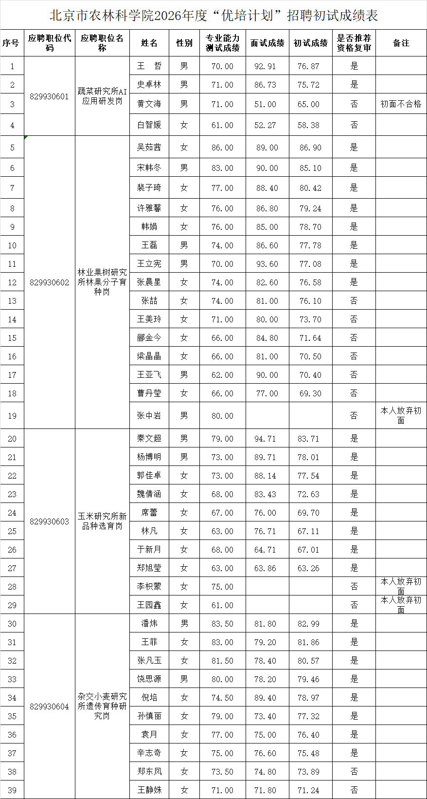 附件1:皇家娱乐城 2026年“优培计划”招聘初试成绩表