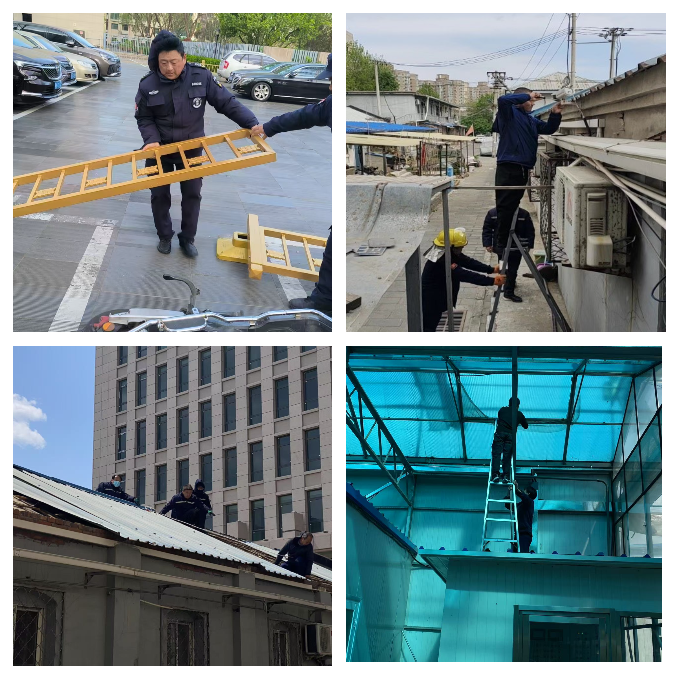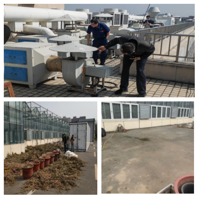 资环所,所长带队检查,办公室利用多种形式再三传达职工注意大风安全防范,清除了楼顶、温室区域安全隐患,对楼体周围及外立面检查。