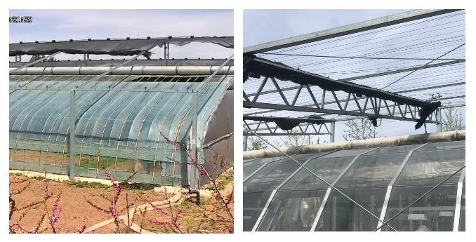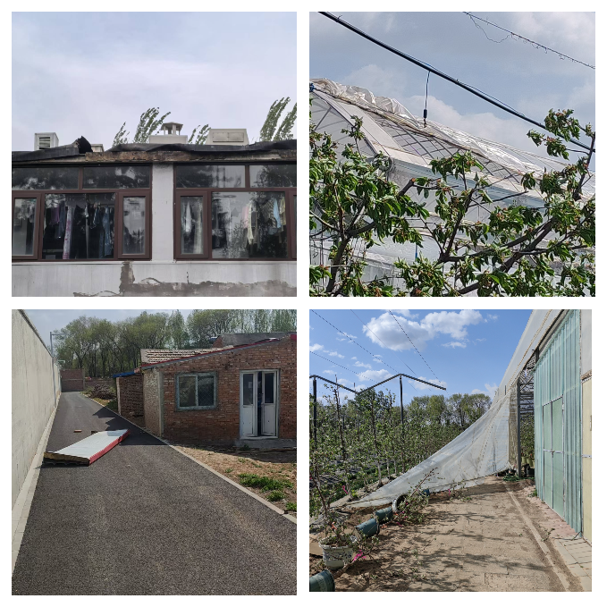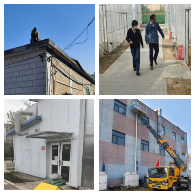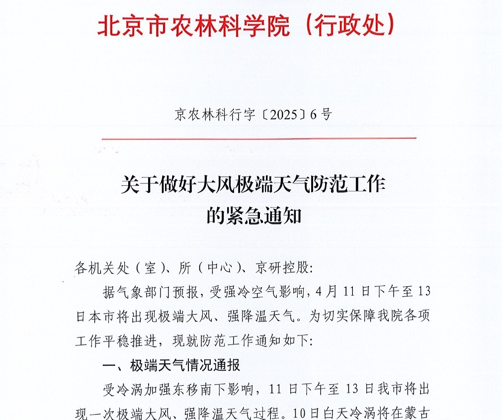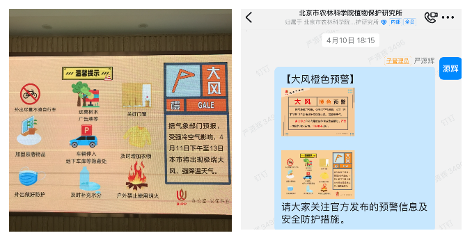 植保所,通过钉钉工作群和楼宇电子显示屏向全员发布应对通知;组织排查院内3个温室及涿州基地大棚的设施情况,收拢外遮阳及棉被,关闭上下风口;加固4号楼西北角围挡;检查加固3、4号楼屋面检修口。