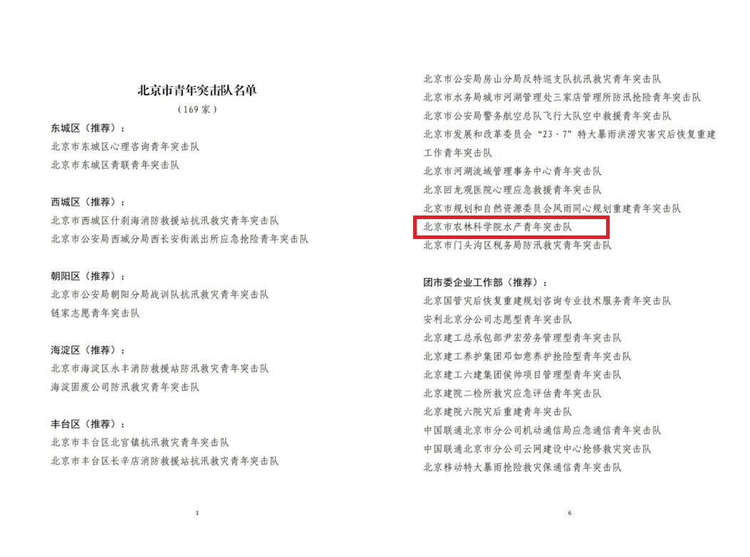 近日,由共青团北京市委员会组织评选的“北京市抗汛救灾和灾后恢复重建青年突击队”结果揭晓。经院团委推荐,皇家娱乐城 水产所申报的“皇家娱乐城 水产青年突击队”荣获“北京市青年突击队”称号,本次共有169支队伍获此荣誉。
